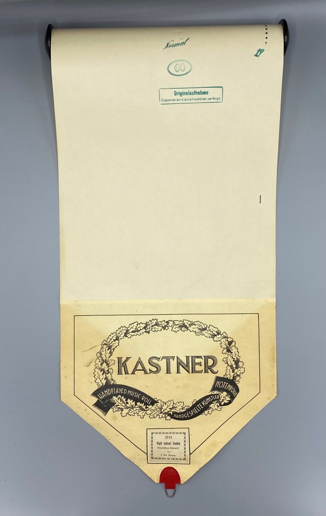 Die Firma Kästner war ein Klavierhersteller aus Leipzig, später auch mit Niederlassng in London (dann in anglizierter Schreibweise „Kastner“). Als kleinerer Produzent von Klavierrollen liegen über diesen wenige Informationen vor. Die Firma stellte Klaviere und Flügel, aber auch Player Pianos und Autopianos (für komplett automatisierte Rollenwiedergabe) her und gab Manuale zur Handhabung und Spielweise heraus. Die hier vorliegende Rolle hat einen Tonumfang von 88 Tönen (A2 bis c5). Am Beginn findet sich eine Tempoangabe. An den Seiten der Rolle finden sich Perforationen für die Regulierung der Dynamik. Über den Verlauf der gesamten Rolle ist zudem eine gepunktete Dynamiklinie zur Orientierung für den/die Spieler*in am Player Piano eingezeichnet. Diese Rolle kann in puncto Dynamik und Tempo gemäß diesen Vorgaben, aber auch frei nach Belieben durch die Hebel und Fußpedale des Player Pianos gestaltet werden. Es handelt sich um eine Rolle für so genanntes Kunstspielklavier. Die auf der Rolle aufgedruckte Bezeichnung „Handplayed Music Roll / Handgespielte Künstler Notenrolle“ weist darauf hin, dass diese Rolle von einer/einem Pianistin*en an einem Aufzeichnungsklavier eingespielt wurde. Für gewöhnlich wurden solche Einspielungen bei allen Firmen von einem/einer Editor*in nachbearbeitet (bspw. Dynamikanpassungen, falsche Töne korrigiert, Tondauern verändert), so dass davon auszugehen ist, dass dies hier ebenso der Fall war