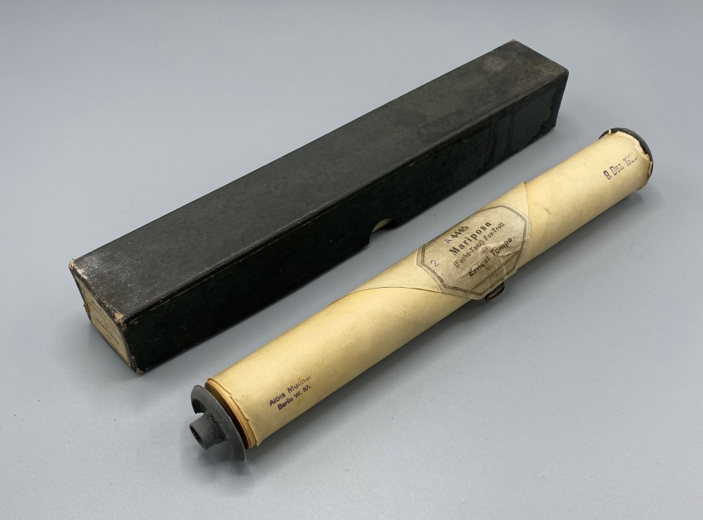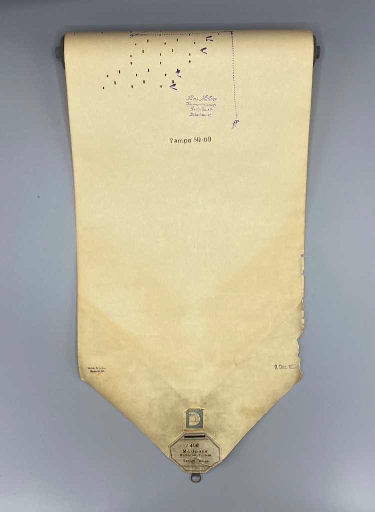 Die hier vorliegende, nicht näher bezeichnte Rolle, versehen mit dem Stempel des Berliner Klavierherstellers Alois Müllner, umfasst eine Skala von 88 Tönen (A2 bis c5). Am Beginn findet sich eine aufgedruckte Tempoangabe. Diese Rollenart hat eine eingezeichnete Dynamiklinie über den Verlauf der ganzen Rolle. Diese Rolle kann durch die Spieler*innen am Pianola durch Hebel und Fußpedale in puncto Dynamik und Tempo entweder den Vorgaben entsprechend oder nach Belieben frei gestaltet werden. Es handelt sich um eine Rolle für so genanntes Kunstspielklavier.