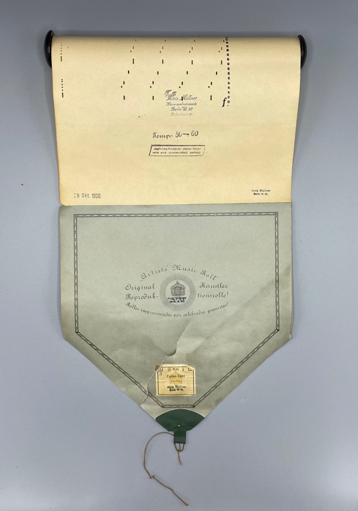 Diese Rolle der Leipziger Firma S.M. (Meißner und Schiller), hier versehen mit dem Stempel des Berliner Klavierherstellers Alois Müllner, umfasst eine Skala von 88 Tönen (A2 bis c5). Am Beginn findet sich eine aufgedruckte Tempoangabe. An den Seiten finden sich Lochungen zur Hervorhebung der Melodietöne (Solodant). Diese Lochungen heben die Melodietöne stärker hervor, da sie eine momentane Verstärkung des pneumatischen Drucks bewirken. Da diese Verstärkung alle auf einer horizontalen Linie liegenden Löcher (und entsprechende Klaviertasten) ansteuern würde, wurde beim Editierprozess darauf geachtet, dass diese Lochungen stets (zeitlich) leicht versetzt zu den übrigen lagen, so dass einzig die Melodietöne dynamisch hervorgehoben wurden. An den Seiten befinden sich weiterhin Perforationen für die Ansteuerung der Pedale. Diese Rollenart hat eine eingezeichnete Dynamiklinie über den Verlauf der ganzen Rolle. Diese Rolle kann durch die Spieler*innen am Pianola durch Hebel und Fußpedale in puncto Dynamik und Tempo entweder den Vorgaben entsprechend oder nach Belieben frei gestaltet werden.