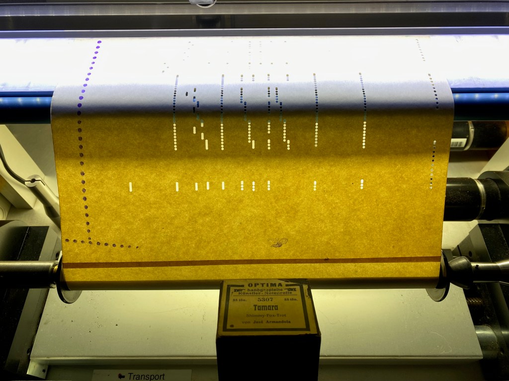 An der linken Seite der Rolle finden sich ferner Lochketten zur Steuerung des Dämpferpedals. Über den Verlauf der Rolle ist eine gepunktete Dynamiklinie für die Orientierung der Spieler*innen am Player Piano eingezeichnet. Es ist möglich diese Rolle in puncto Dynamik und Tempo entsprechend der aufgedruckten Vorgaben oder frei nach Belieben zu gestalten. Es handelt sich um eine Rolle für so genanntes Kunstspielklavier.